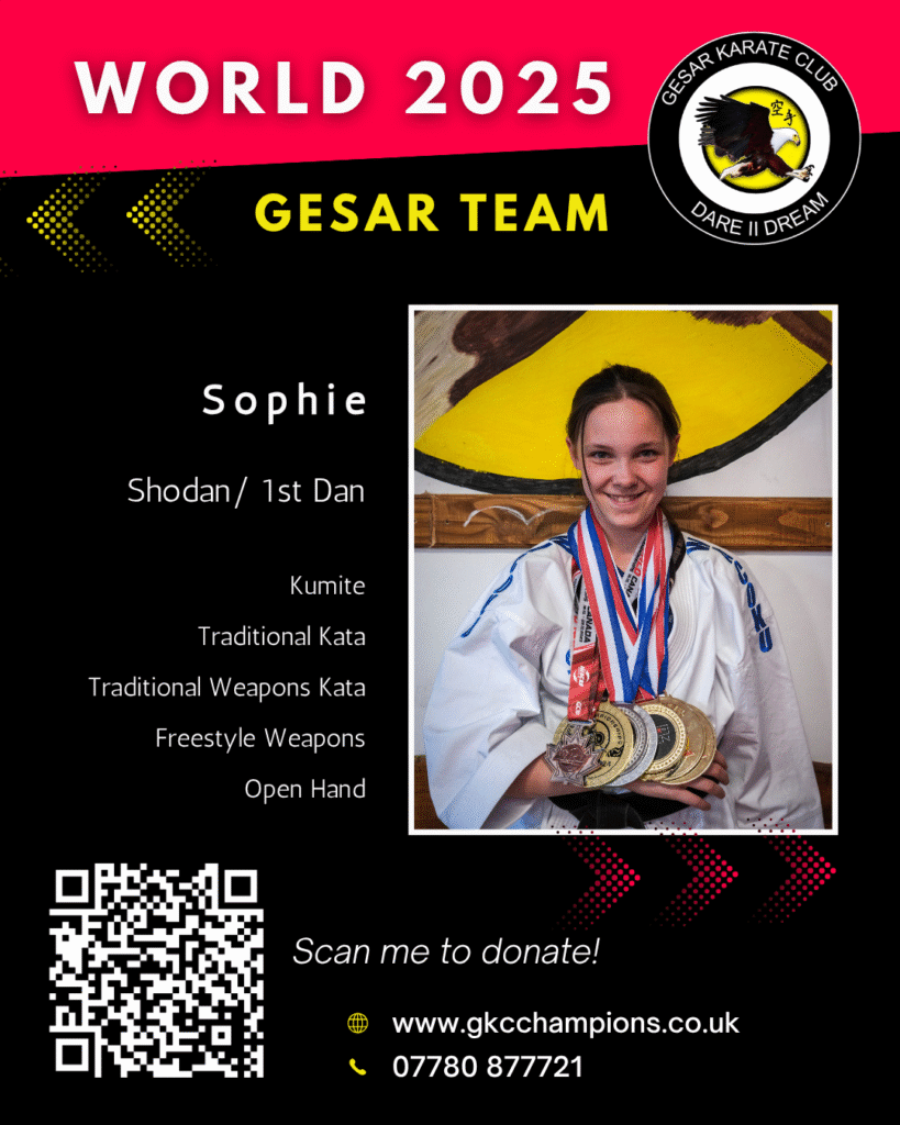 At this year's World in Germany, Sophie is going to be competing in Kata, Kumite, Traditional Weapons, and Open Hands with a possible entry into freestyle weapons, in which she has been training hard and made a great debut in the latest competition. Sophie is always extremely thankful for all the support and backing from donations/sponsorships, as it gives her more drive to push through the intense training, and she hates to let anyone down.